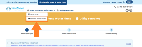 - Hover over the Sewer and Water Mains Plans menu at the top of the page.