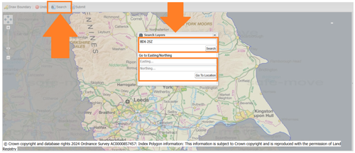 Once the the map of your required area loads into your browser window, use the navigation tools (indicated in the screenshot below) to centre your view: